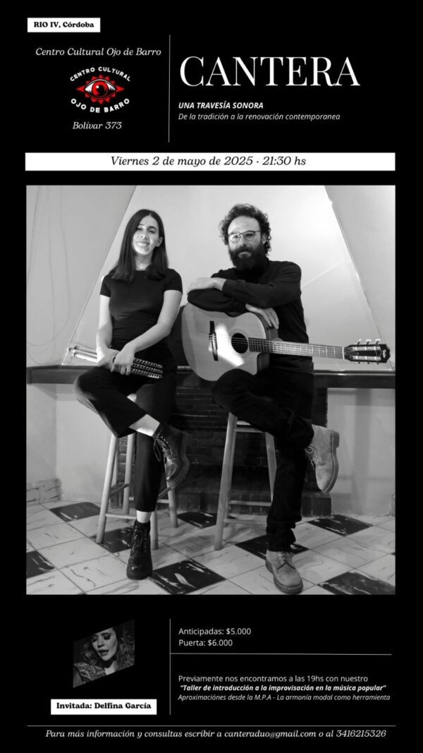 Se presenta, desde Villa María, el dúo Cantera, integrado por Milena Lippl (ARG) en aerófonos andinos y voz, y Sergio Guízar (MÉX) en guitarra acústica y voz. Invitada: Delfina García.