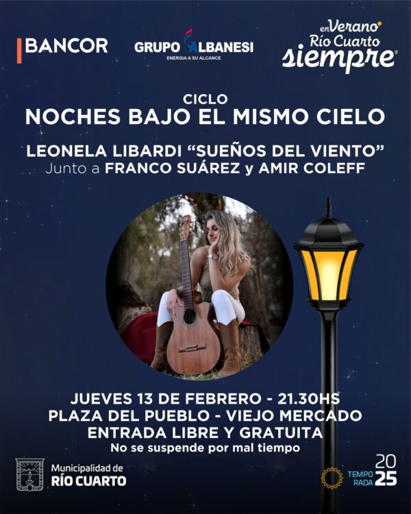 “Sueños del viento” es una propuesta artística que recorre las raíces del folklore argentino con una mirada sensible y renovada. Interpretada en la voz de Leonela Libardi, junto Franco Suárez y Amir Coleff en guitarras, la propuesta musical nos invita a viajar por paisajes sonoros que evocan la esencia de la tierra, las historias de su gente y los sueños que de su pueblo lleva el viento. A través de diversos ritmos y especies musicales de nuestro territorio, “Sueños del viento” celebra la tradición, al tiempo que la conecta con nuevas narrativas, postales y sentidos.