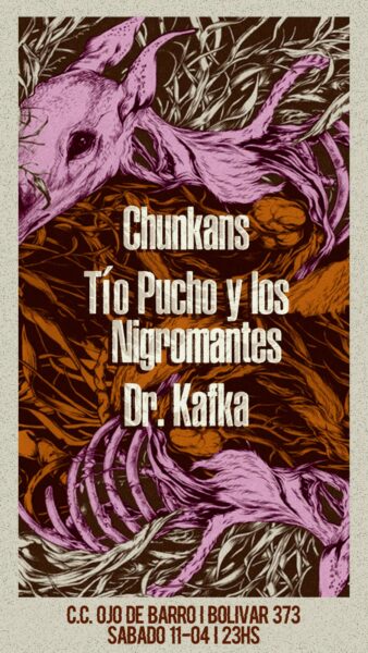 Este sábado 11 de abril a las 23hs. se presentan en vivo las bandas Chunkans, Tío Pucho y los Nigromantes y Dr. Kafka. Anticipadas: $8000.