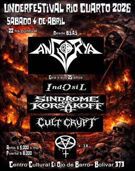 Este sábado 4 de abril a las 22hs. se realiza el Unferfestival Río Cuarto 2026 con las actuaciones en vivo de las bandas Angorya (Gira 25 años), Indosil, Síndrome de Korsakoff y Cult Cryft. Anticipadas $6000. En puerta: $8000.