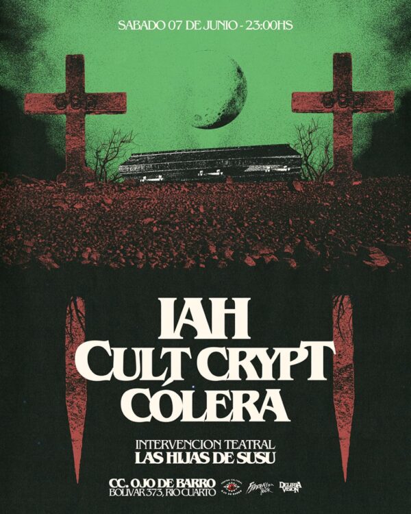 El sábado 7 de junio desde las 23hs., con entrada anticipada a $6000, se presentan las bandas IAH, Cult Crypt y Cólera. Intervención teatral de Las Hijas de Susú.