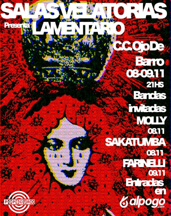 Sábado 8 y domingo 9 de noviembre. 21hs. Anticipadas en alpogo (capacidad limitada). La convocante banda local Salas Velatorias presenta su nuevo disco Lamentario. Invitados: Molly y Sakatumba (sábado) y Farinelli (domingo).