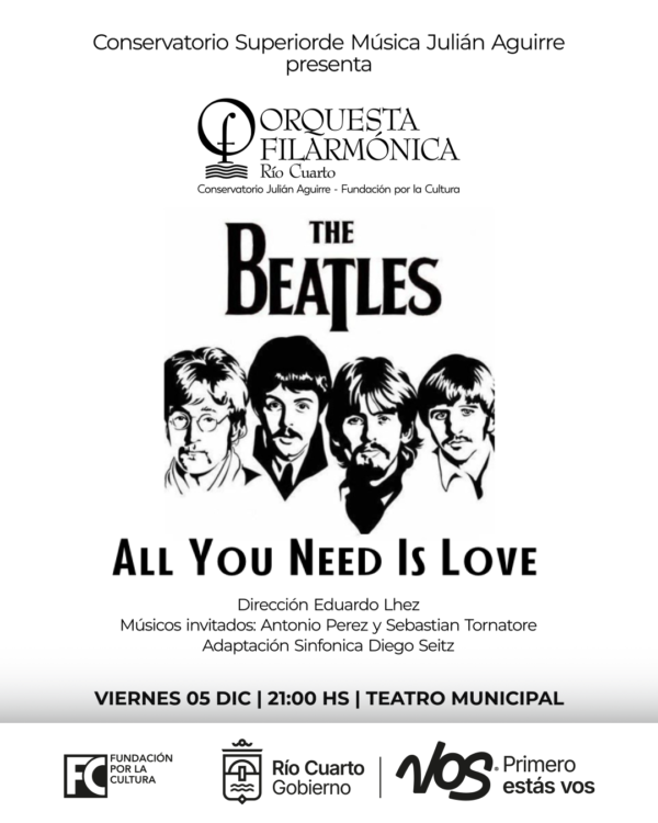 La Orquesta Filarmónica de Río Cuarto, dirigida por el Eduardo Lhez, presenta All you need is love, un espectáculo imperdible de música de Los Beatles en formato Sinfónico. Los clásicos de siempre adaptados a este formato por el prof. Diego Seitz y con el guitarrista Antonio “Pichi” Pérez como música invitado, además de Sebastián Tornatore.
